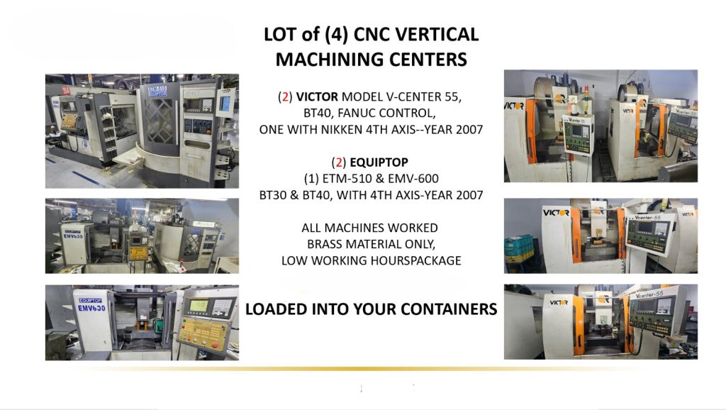 Victor V-Center 55 / Equiptop ETM-510 / Equiptop ETM-600 Total 4 CNC Vertical Machines a Lot Sales is listed for sale. Access to full specifications and pricing is available for registered members.